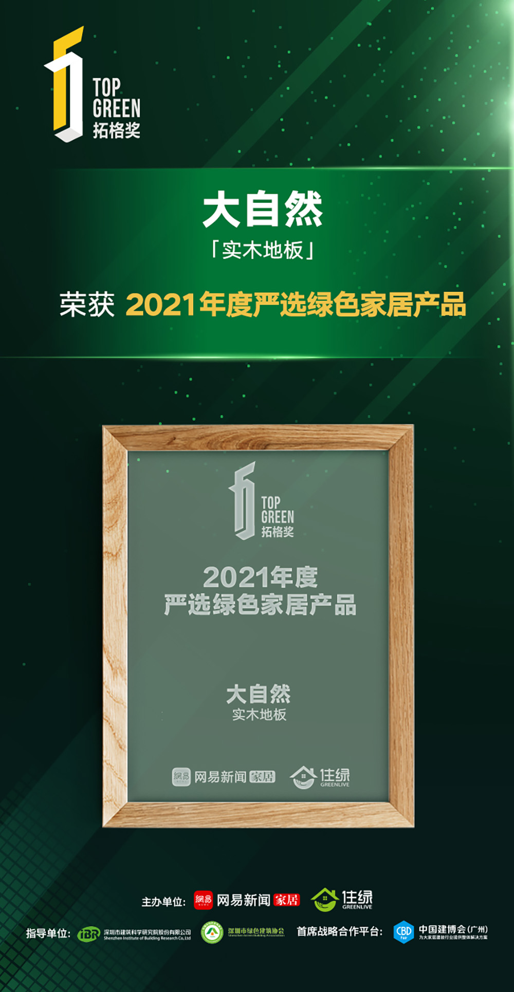 2022年1月15日,“嚴選好家 向好生活提案——2021網易中國家居冠軍榜暨拓格獎頒獎盛典”在線上隆重舉行,家居領袖齊聚云端,共襄行業年度盛宴。大自然家居憑借實力獲得“2021年度中國家居冠軍榜行業領軍品牌”和“2021年度綠色環保先鋒品牌”兩大獎項,大自然實木地板榮獲“2021年度嚴選綠色家居產品”。