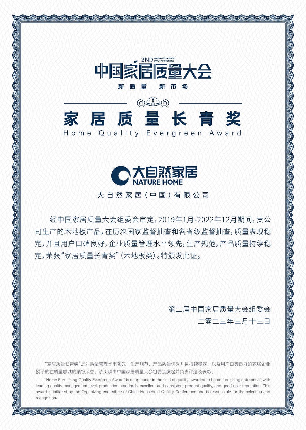 品質長青,大自然家居榮獲“家居質量長青獎”