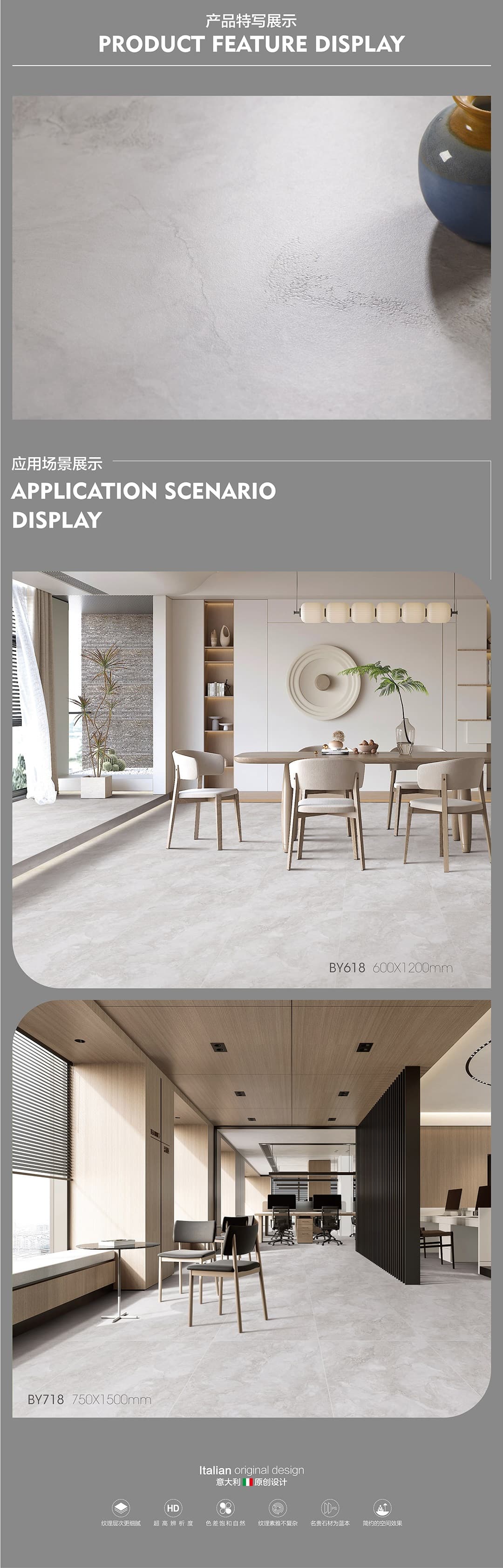 | 產(chǎn)品特性 | 表面柔和,防污效果強(qiáng),防滑R10指標(biāo)高,抗折強(qiáng)度好 |